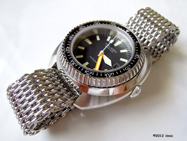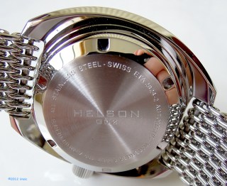 The dimensions of the original were maintained: A 43mm diameter (excluding crown; 46.2mm with the crown) and just shy of 47mm lug-to-lug. Lug width is 20mm. What was unique about the SPH1000 when it was introduced at Basel in 1970 was its 1,000 meter depth rating, almost unheard of in a production model mechanical watch. It was accomplished by a case that featured thick, sturdy components. Combined, the watch is almost 18mm in height. And so is the Helson Turtle. Weight is acceptable for a watch of this size, coming in under 190g on the mesh bracelet – heavy enough to feel substantial, but not so heavy that wearing it becomes a distraction.