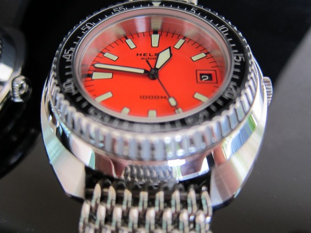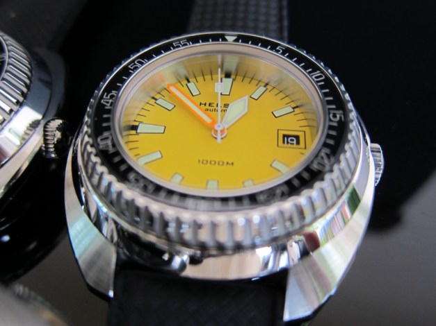 The Helson Turtle will be available with black, orange or yellow dials, all with black bezels. It will include a mesh bracelet with deployant clasp and safety, along with an assortment of extensions for proper fit, a textured, perforated rubber strap, spare lug pins and a bracelet changing tool, all packaged in Helson’s now-familiar padded, waterproof cylinder. Price will be US$899, including shipping, and the watch will be available in mid- to late-June.